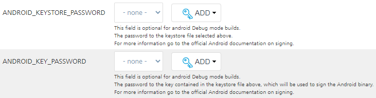 1. While configuring the build parameters for the buildIrisApp job, next to ANDROID_KEYSTORE_PASSWORD, click ADD. A drop-down list appears.