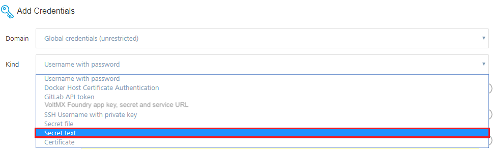 3. In the Add Credentials window, from the Kind list, select Secret Text.