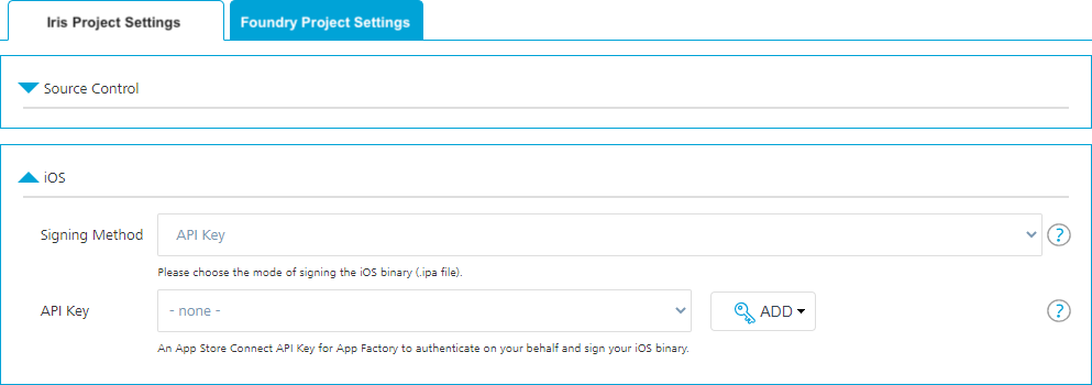 1. While configuring the Project Settings, in the iOS section, next to the API Key parameter, click ADD.