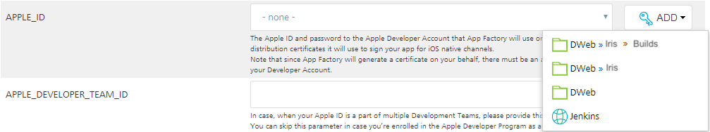 1. While configuring parameters for the buildIrisApp job, next to the APPLE_ID parameter, click ADD.