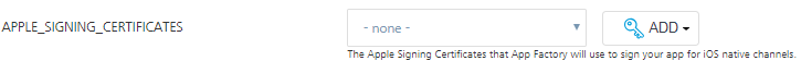 1. While configuring parameters for the buildIrisApp job, next to the APPLE_SIGNING_CERTIFICATES parameter, click ADD. A drop-down list appears.