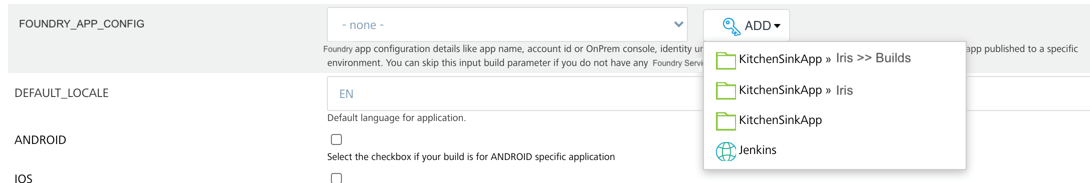 1. From the VoltMX Iris & Foundry section in the buildIrisApp job, next to the FOUNDRY_APP_CONFIG parameter, click ADD. A drop-down list appears.