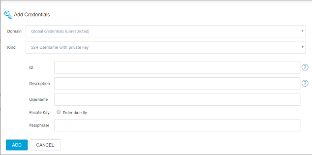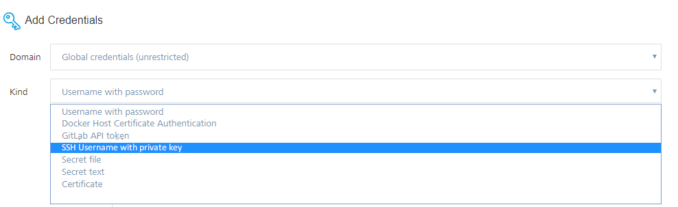 3. In the Add Credentials window, from the Kind list, select SSH Username with private key.