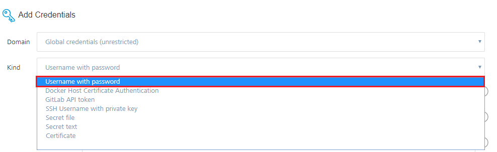 3. In the Add Credentials window, from the Kind list, select Username and Password.