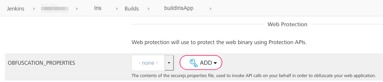 2. From the Web Protection section in the buildIrisApp job, next to the OBFUSCATION_PROPERTIES parameter, click ADD. A drop-down list appears.