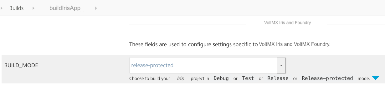1. In the VoltMX Iris & Foundry section of the buildIrisApp job, from the BUILD_MODE list, select release-protected.