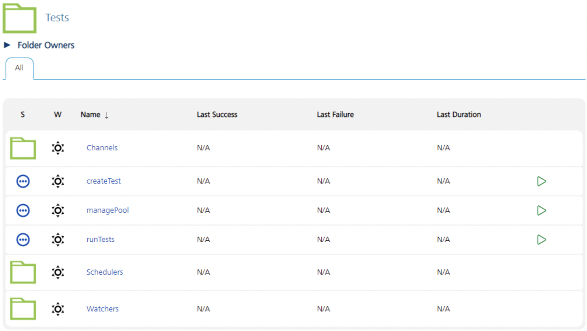 The Tests folder contains jobs to create tests, run tests, and manage device pools. It also contains sub-folders that store the created tests based on the trigger mechanism.