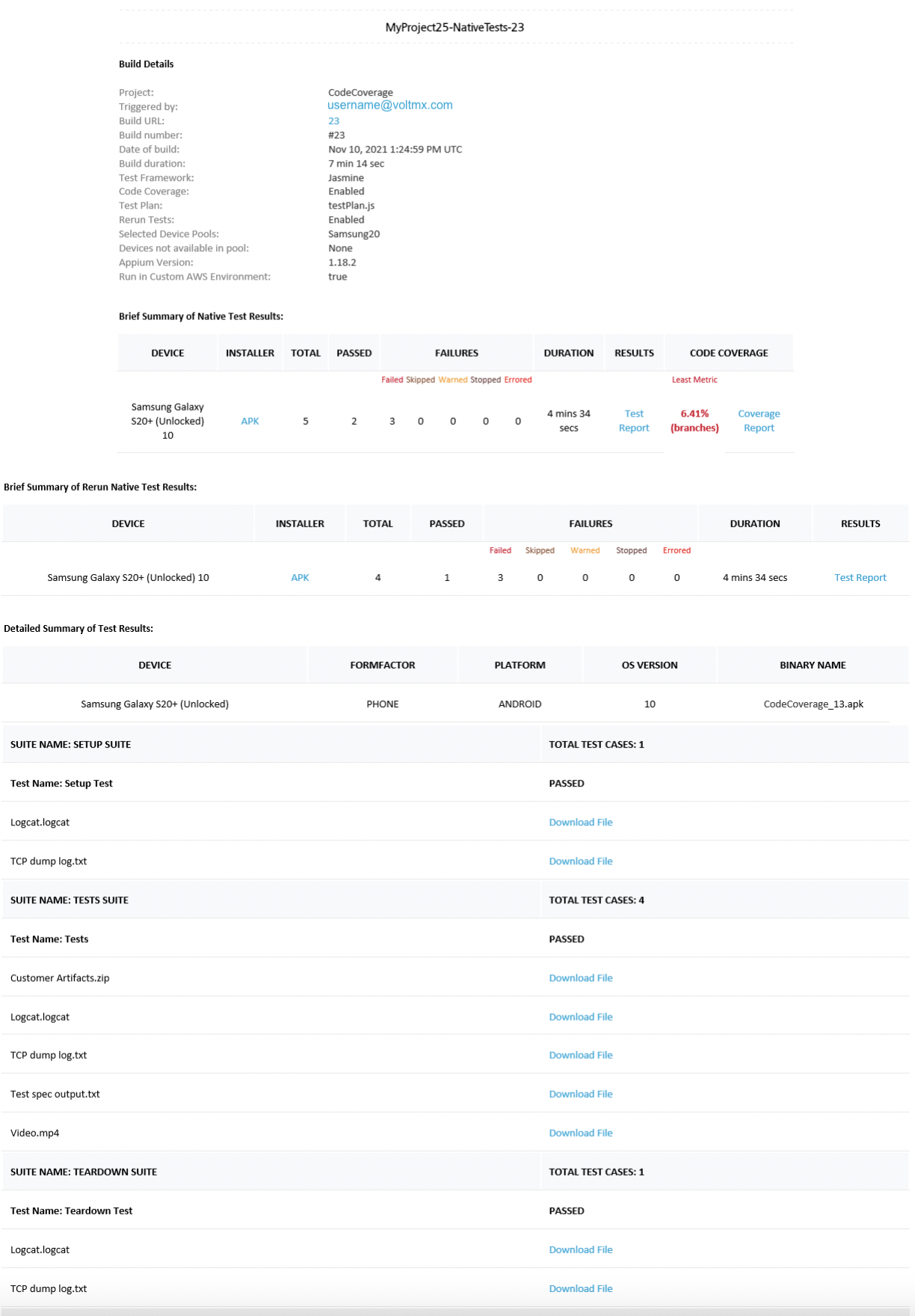 The test results section also contains information about the Appium Tests that are run on a custom AWS environment. This section contains links to the following files: