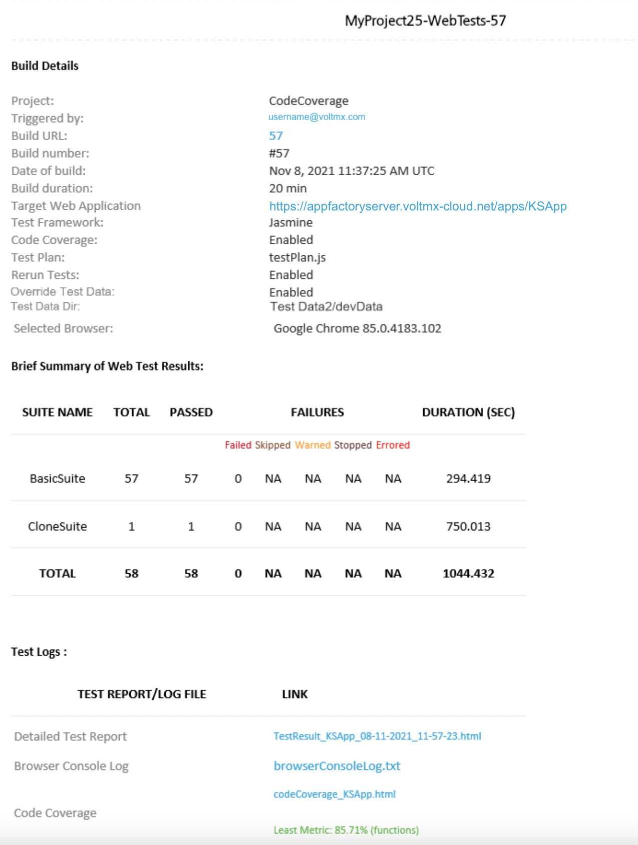 This section contains a brief summary of the tests that are run on your web app. It also contains links to test logs such as the Detailed Test Report and the Browser Console Log.