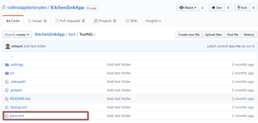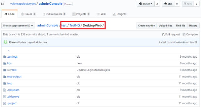 Specifies the branch, release tag, or the commit ID of the repository that contains the test files.The tests must be placed at the following location:<Repository-Root>/<Project-Root>/test/testNG/The <Repository_Root> must be configured in the Project Settings. The <Project-Root>is the name of the project that is configured while creating the Iris project in App Factory. |