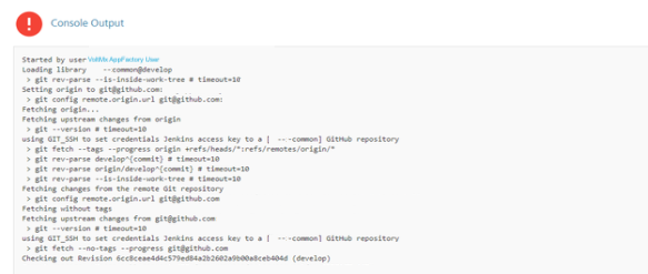 - From the details page of the failed build, select the Console Output on the left panel. The Console Output Log opens in the right pane.
