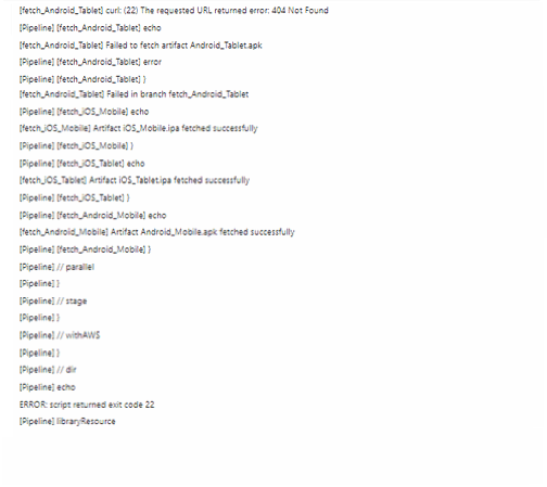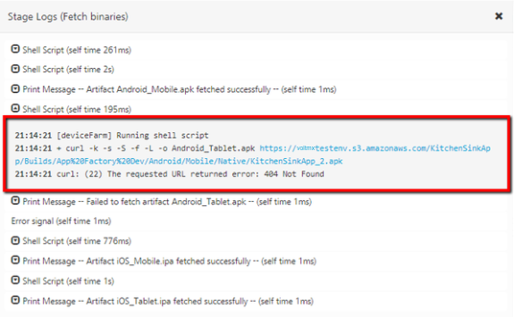 - Scroll to find errors in the log that caused the build to fail. For example, you can trace an error that is related to invalid Android Tablet URL.
