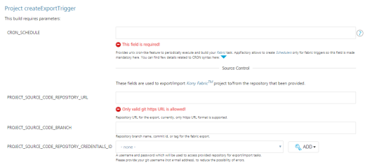 CRON_SCHEDULE - Specify the UNIX cron-like feature to periodically execute and build your Foundry task. The field is mandatory as App Factory allows you to create Schedulers only for Foundry triggers.