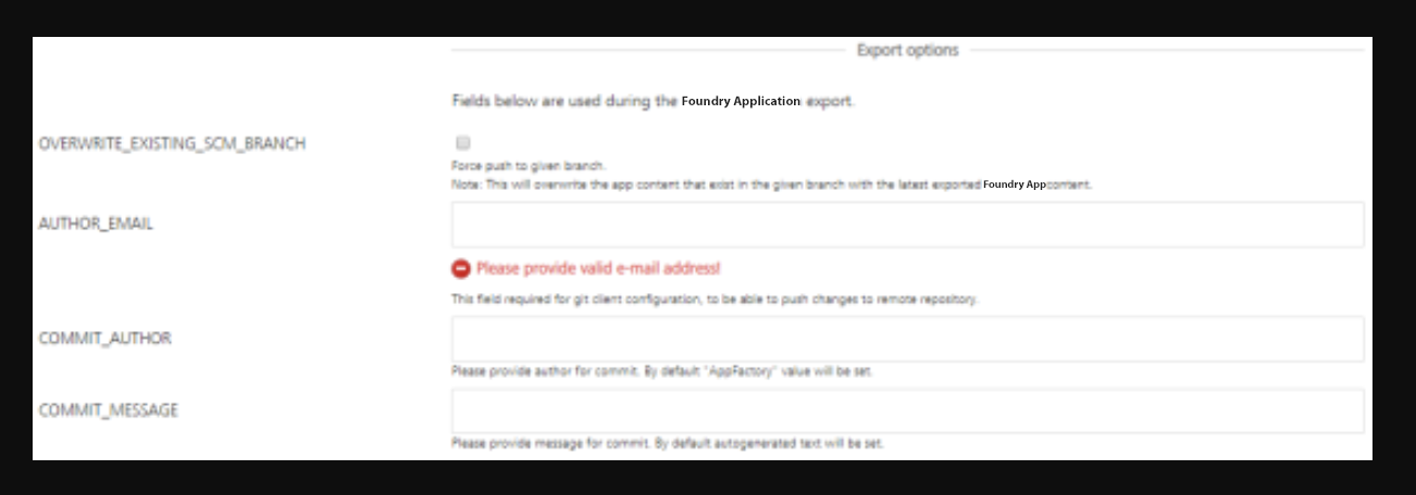COMMIT_AUTHOR - Provide author for commit. The App Factory value is set by default.