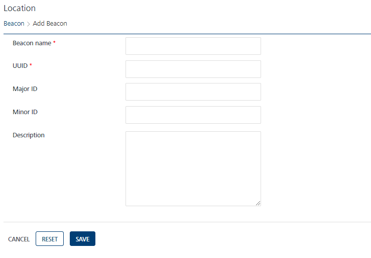 Click New Beacon and this will display the screen to enter the beacon information. Enter the Beacon Name and the UUID as these are the required parameters. The UUID or the universally unique identifier is an id that identifies a beacon. The Major Id, Minor Id and the Description are not needed and will be ignored.