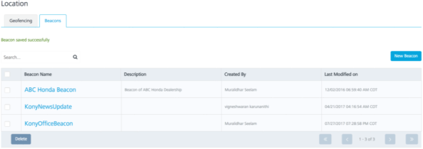 - The next screen displays the list of the all beacons including the VoltMXLocationBeaconSegment that you have just created.