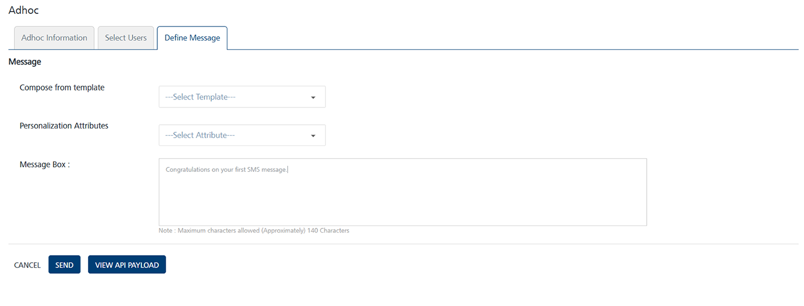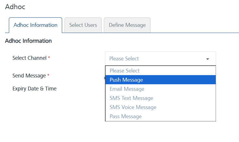 2. In the Adhoc section, select the SMS Message channel. Click Next –Select Users to navigate to the next screen.