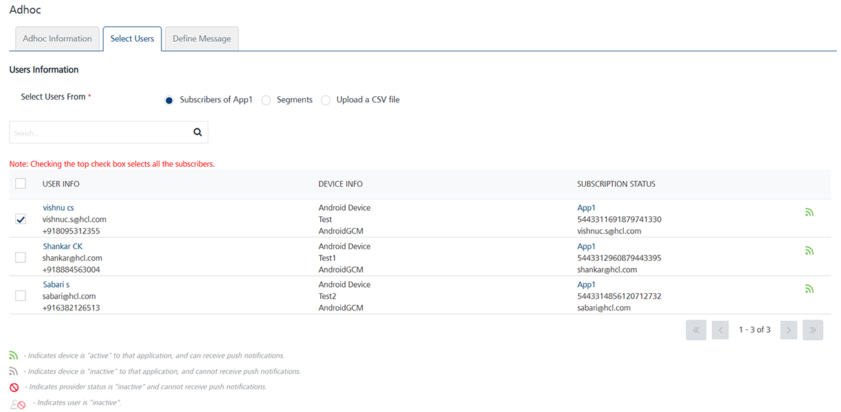 5. In the Select Users section, choose the Subscribers of EngagementTestApp option and the user to send the message. Click Next –Define Message to navigate to the screen to enter the message to be sent.