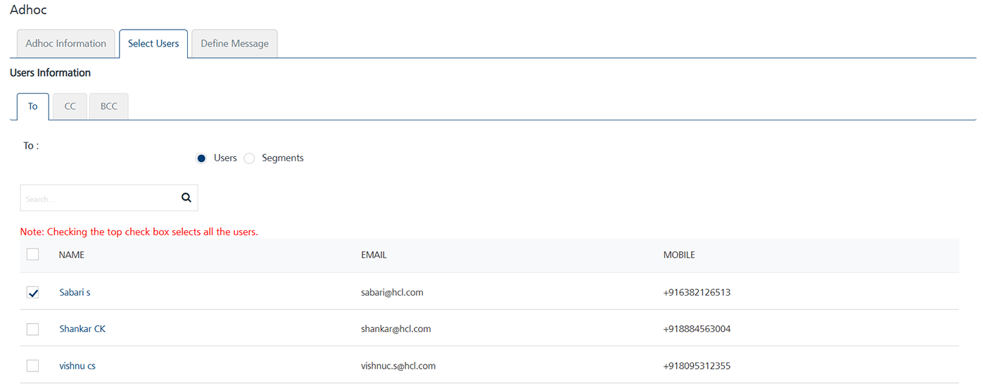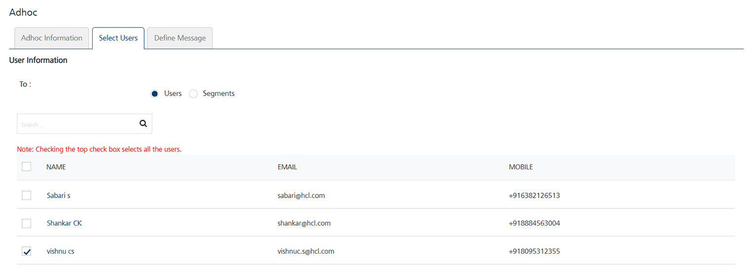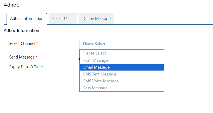 2. In the Adhoc section, select the Email Message channel. Click Next –Select Users to navigate to the next screen.