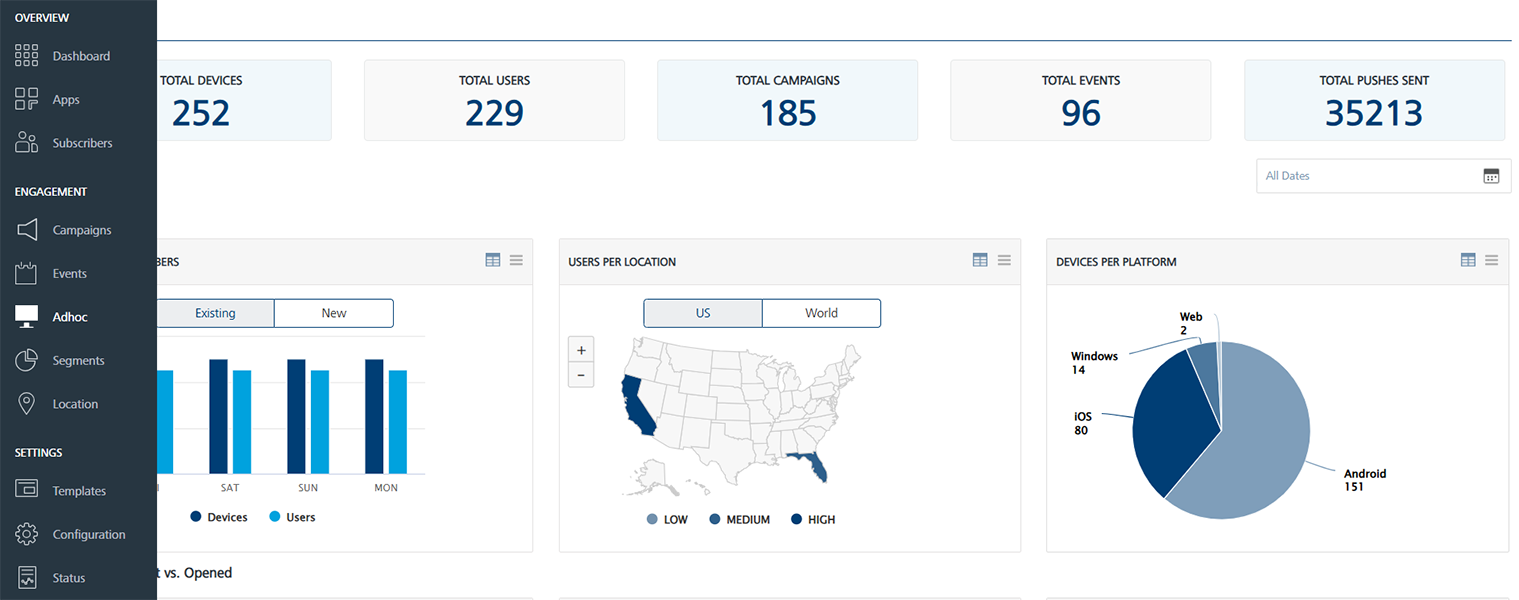 1. Login to Volt MX Engagement Services console of the Volt MX Foundry. Once the log in is successful, you will see the screen as below. Click Adhoc under the Engagement section from the left pane.