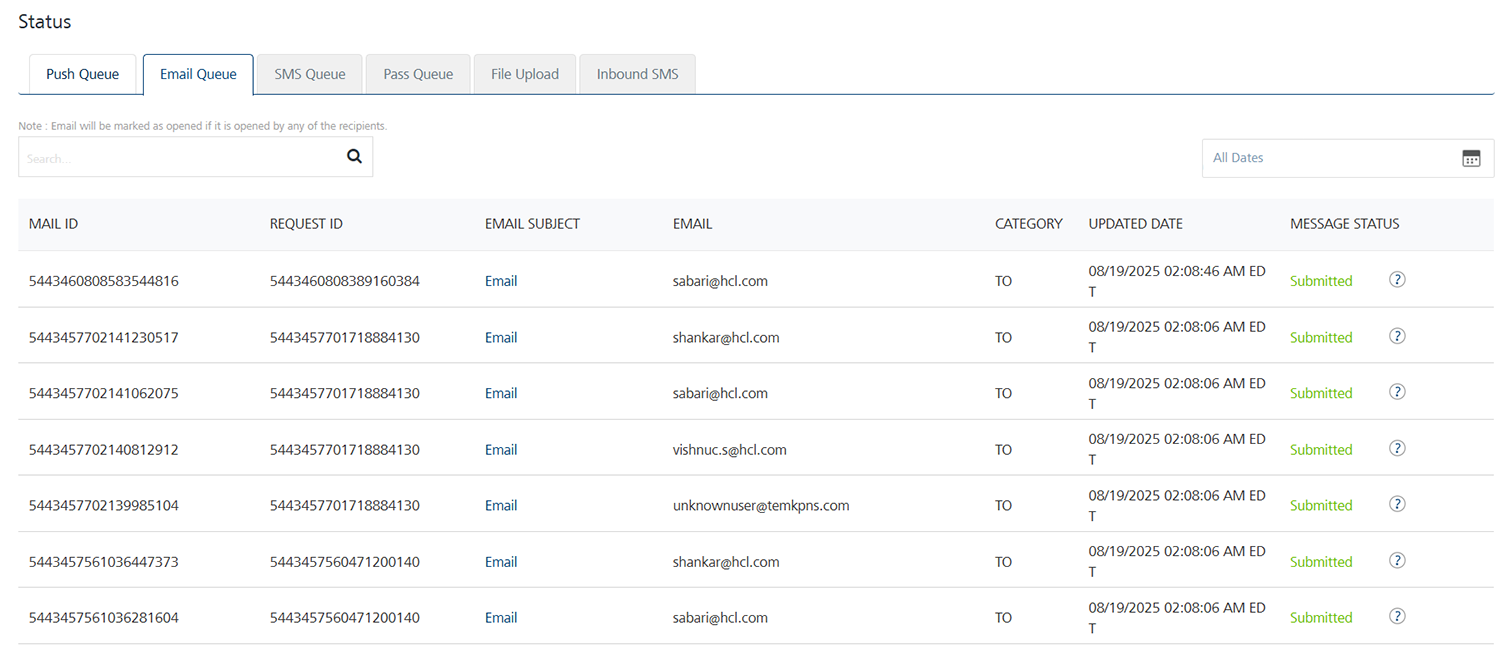 6. As mentioned in the previous section, you can also check the status of the sent Email message from the Status option under the Settings section of the Engagement Server. Click the Email Queue tab to see the status of the first email message as successfully submitted.
