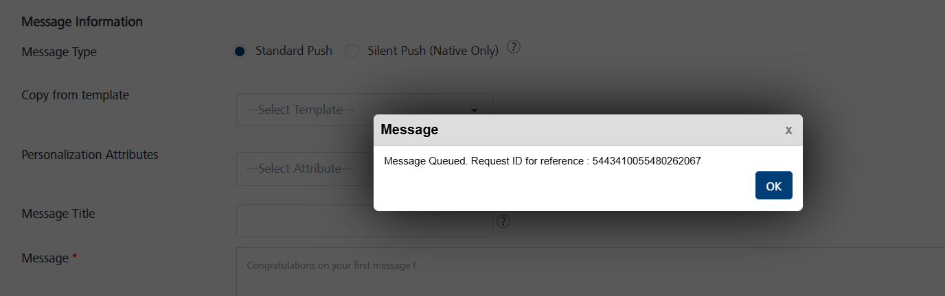 7. Once the push message has been successfully submitted for delivery, you will see the notification message. Click Ok to continue.