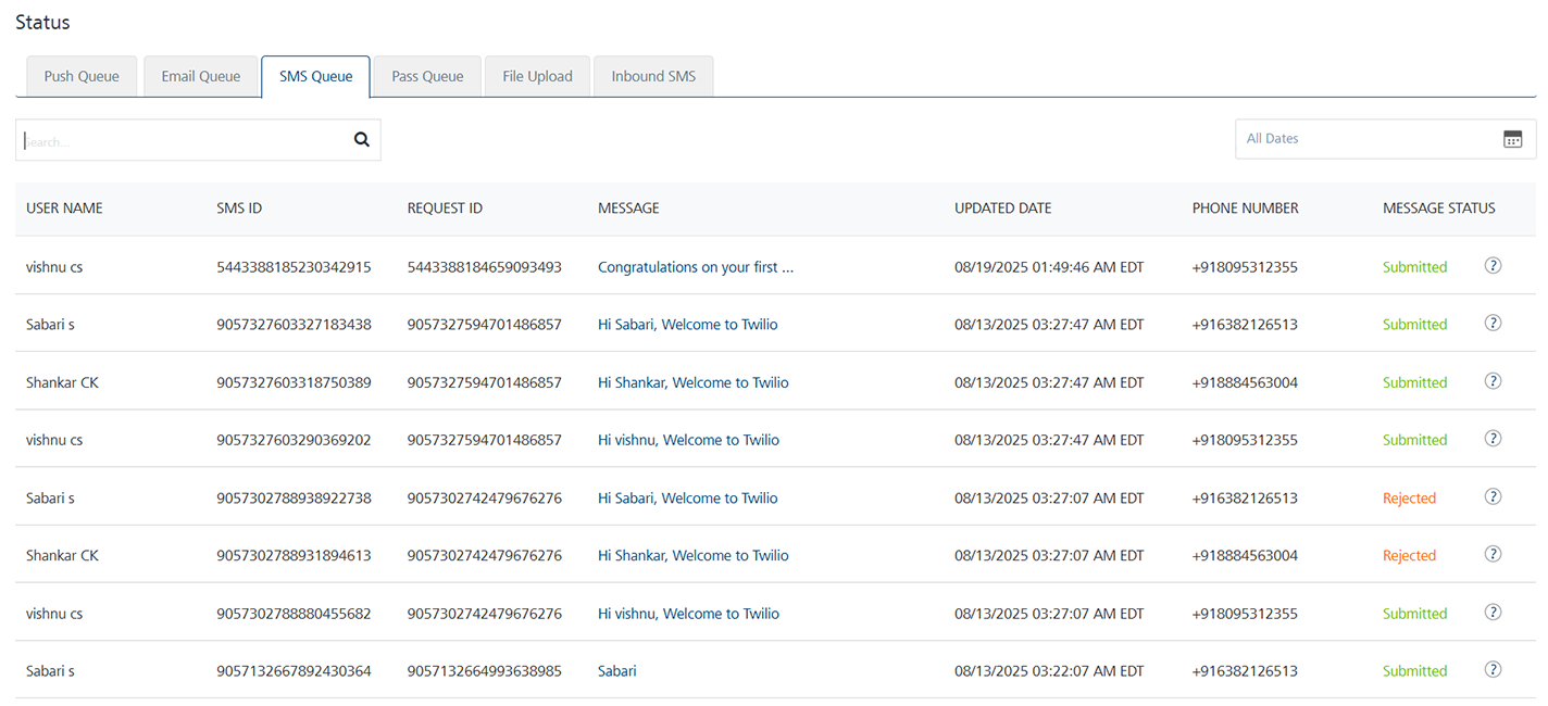 5. As mentioned in the previous section, you can also check the status of the SMS message from the Status option under the Settings section of the Engagement Services console. Click the SMS Queue tab to view the first status of the first SMS message as successfully submitted.