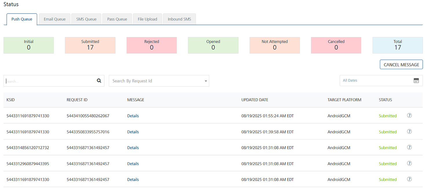 9. Click the Message Queue tab to view the status of the push messages sent. As you can see from the screen below, the first message in the list is what was submitted earlier. The status of this message indicates that it was successfully submitted.