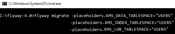 C:\>flyway migrate -placeholders.VMS_DATA_TABLESPACE="USERS" -placeholders.VMS_INDEX_TABLESPACE="USERS" -placeholders.VMS_LOB_TABLESPACE="USERS"