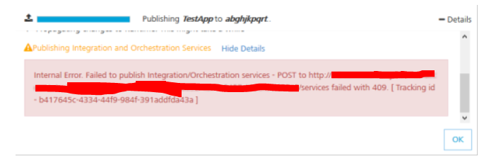 Workaround: You must wait until an app in the row is published successfully, and then re-publish the next app.