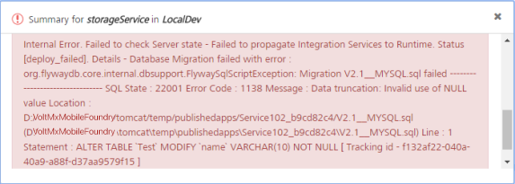 For example, if your application size is 1024 kilobytes (1MB), and you try to publish a 2048 kilobyte (2 MB) application from Volt MX Iris, an error appears while publishing. Increase the size of the server database to a value more than 2048 kilobytes (2 MB) for publishing the application.