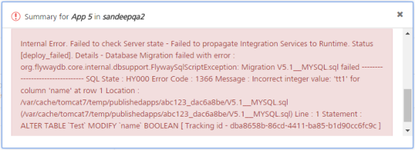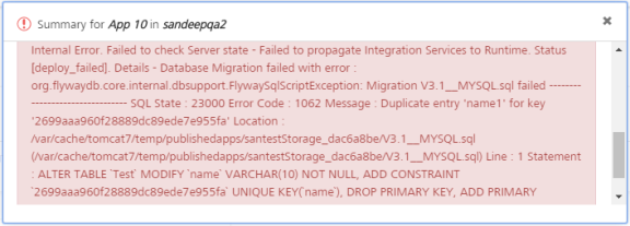 • If you change datatypes (for example: String to Boolean, Number to Date) and there is some data in that field, republish fails.