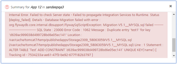 - If the size of your application is more than the variable size of the server database, an error occurs while publishing. Ensure the variable  max_allowed_packet_size  is set to a higher value than the application size.