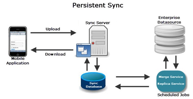 In this strategy, the Sync Framework buffers / persists the backend data; during synchronization of a mobile client, the delta for that client is calculated based on the existing data in the Volt MX Foundry Sync Server. You can schedule replication jobs to occur at predetermined intervals to update the Volt MX Foundry Sync Server data. These jobs compare backend data with the data that is persisted in the Volt MX Foundry Sync Server and decide whether an object needs to be updated.