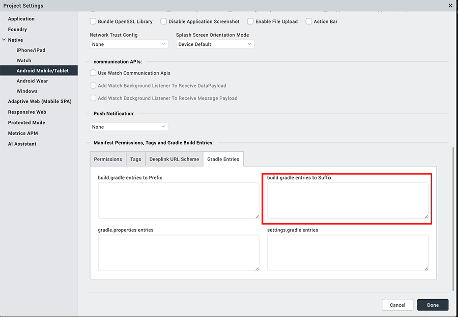 Open the Android native specific project/application settings in Iris. For more information, refer to the Set Native App Properties topic in Iris.