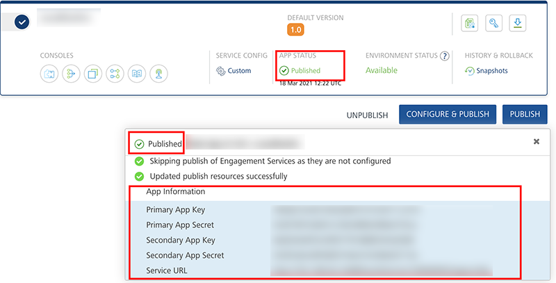 After the app is published, the app status changes to Published in the Select environment to publishing section. The Publishing dialog also displays details for published services and primary app key/app secret, secondary app key/app secret, service URL, and Web application URL. For more information, refer to Separate App Key/App Secret for Native and Web Channels.