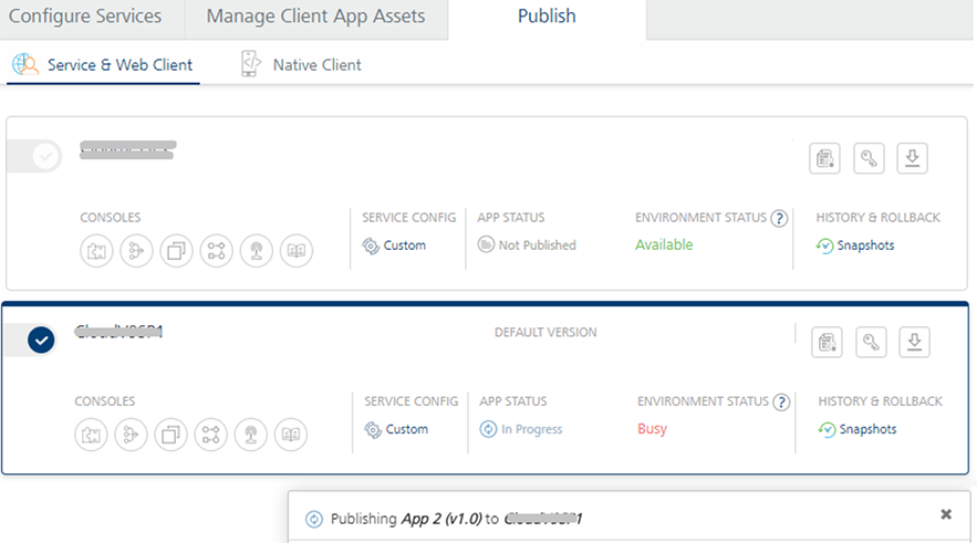 When you publish apps in the Console, the apps are published with the Asynchronous publish mode. By default, the asynchronous publish is enabled. When asynchronous publish is initiated, the Publish dialog can be closed and the app publish process continues in the background. The Asynchronous publish helps you to unblock the user interface (UI) when an app publish is in progress. While the app is in asynchronous publish progress, you can continue work in the console such as creating or modifying other apps and services. When you publish apps, your apps are published to clouds or environments.