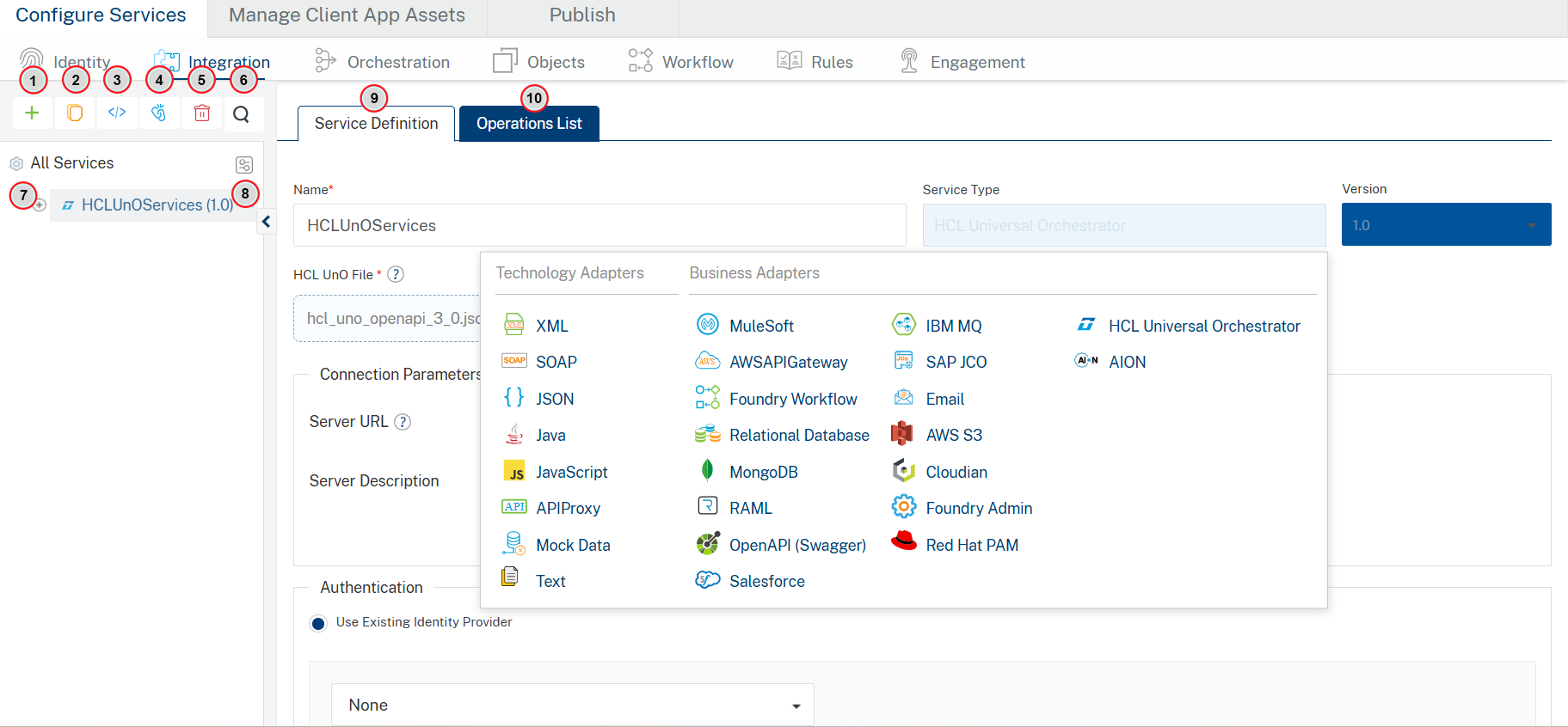 Number Section Description 1 Add Allows you to add the following:Add New ServiceUse ExistingAdd New Operation 2 Clone Allows you to duplicate an existing service. Changes made to a cloned service will not impact the original service. 3 Sample Code A dynamic code is generated based on the configuration of a service. You can use this code in your SDK. 4 Unlink Allows you remove the service from the Integration services section of an app. When a service is unlinked, it is disassociated from a particular app. 5 Delete button Allows you to delete a service. 6 Search button Allows you to search services and operations in the Services section. 7 Services section Configured services for an app.You can click the expand or collapse button of a service to show or hide operations in the services. 8 Show / Hide button Allows you the show or hide the tree. When you hide the tree section, the right pane is used for service definition or operations details. 9 Service Definition tab Allows you to configure service defection for an integration service. 10 Operations List tab Allows you to configure operations for an integration service. The Operations List tab appears only after you save the details in the service definition tab. -