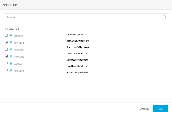The Select User windows appears. All the owners and admins might not be shown in the list of Specific access users.