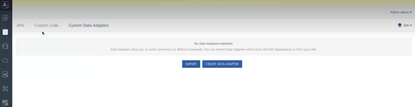 - VoltMX Foundry App Based - You can use this type of Custom Data Adapter if you have already configured any Volt MX Foundry services connected to your backend. These Custom Data Adapters should be in a structured zip archive. You can add these Custom Data Adapters by clicking on the IMPORT button.