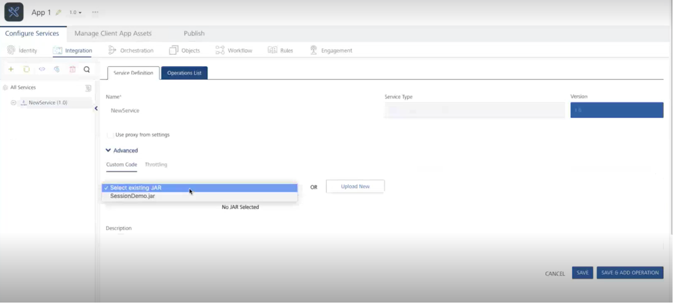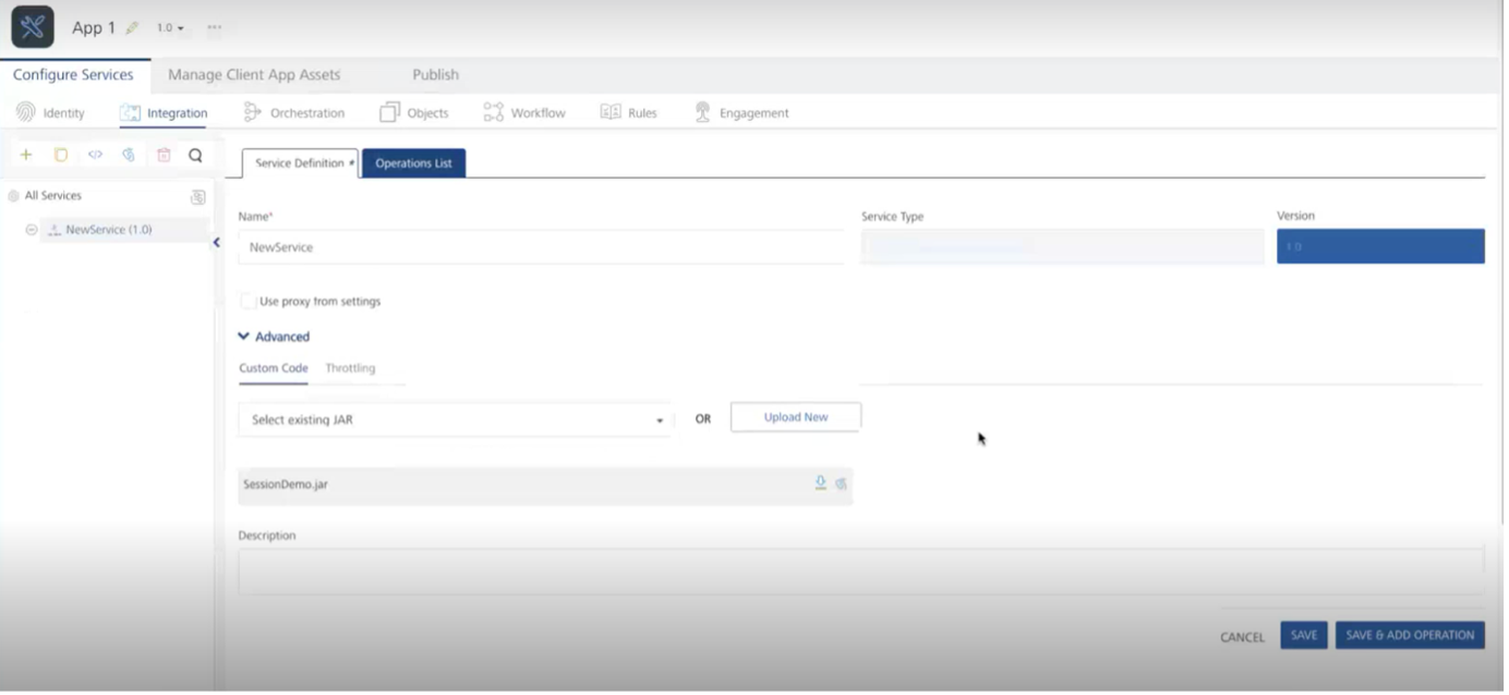 You can also configure the features in the Advanced tab if you want to add a custom code or enable throttling for your Service. For more information, you can refer to the Integration section of the Volt MX Foundry User Guide.