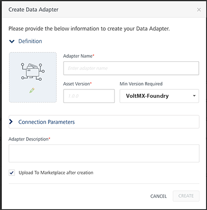 - Upload to Marketplace after creation - Select this check box if you want to upload your Custom Data Adapter to the Volt MX Marketplace.