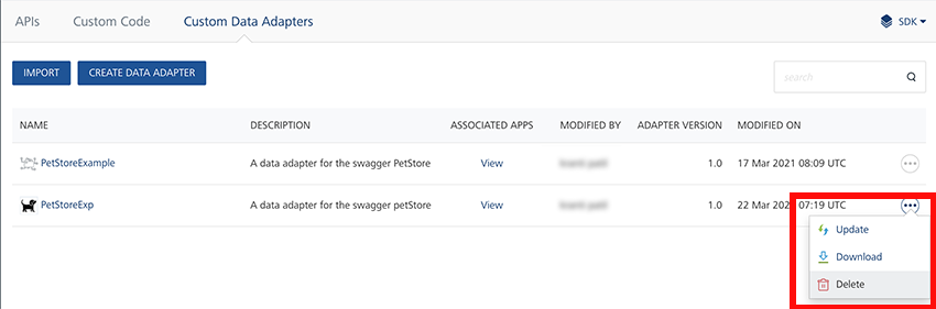 - Update - Update the existing Custom Data Adapter. Clicking on this option will open a window to import a Custom Data Adapter.