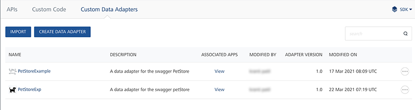 The Custom Data Adapters page on the console has a list of all the existing Custom Data Adapters and their metadata. You can view all the apps associated with any of the Custom Data Adapters. You can also view the Modified On and Modified By details on this page.