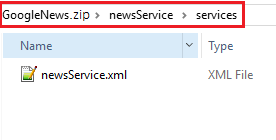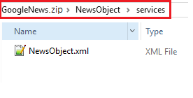 In the given example, NewsObject is the name of the Object Service, and newsService is the name of the Integration Service. - The second level folder's name should be services. The folder should contain your service definition file.