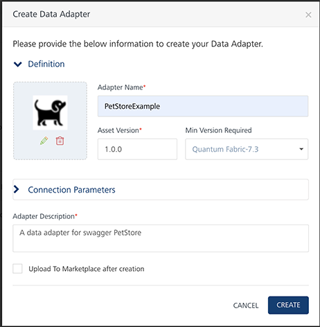 - Configure your Custom Data Adapter based on the steps given in the Creating a Custom Data Adapter section. Let us name the adapter PetStoreExample.