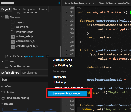 Navigate to the Project menu, and right-click Volt MX Foundry app, and select Generate Object Model. Now, the object service is enabled for Data Pre and Post Processors for Models registration. You can now write your logic to be applied for selected fields in the data model.