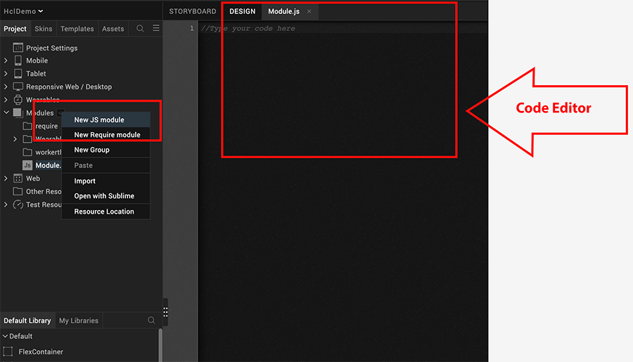 Navigate to the Project menu, and right-click Volt MX Foundry app, and select New JS module. A new JS module is created, and the Code editor become active.
