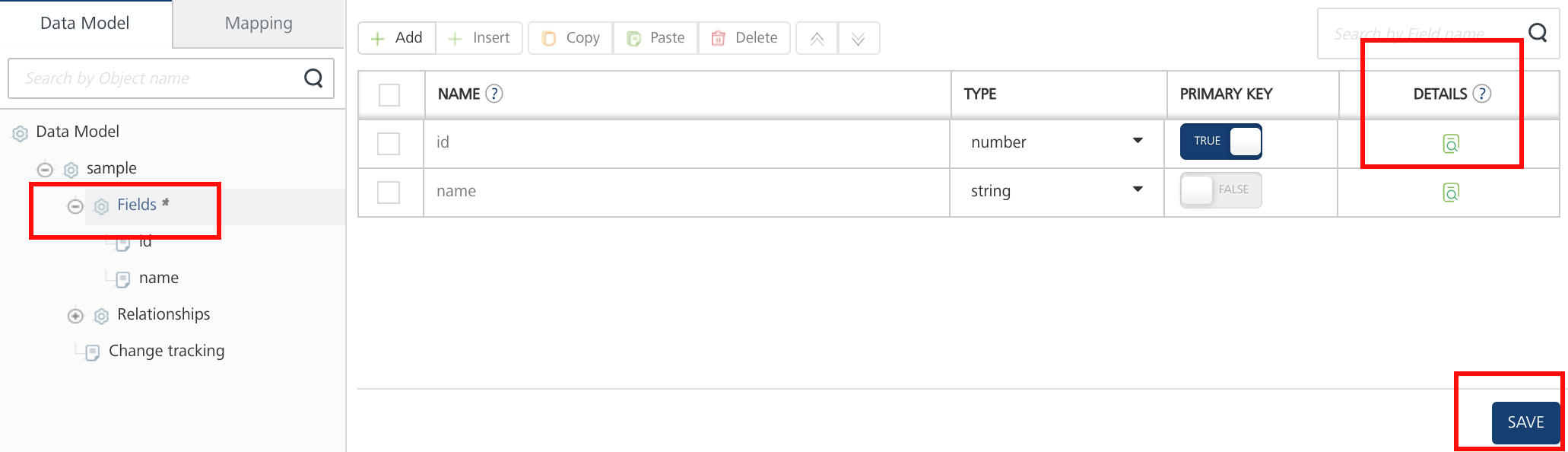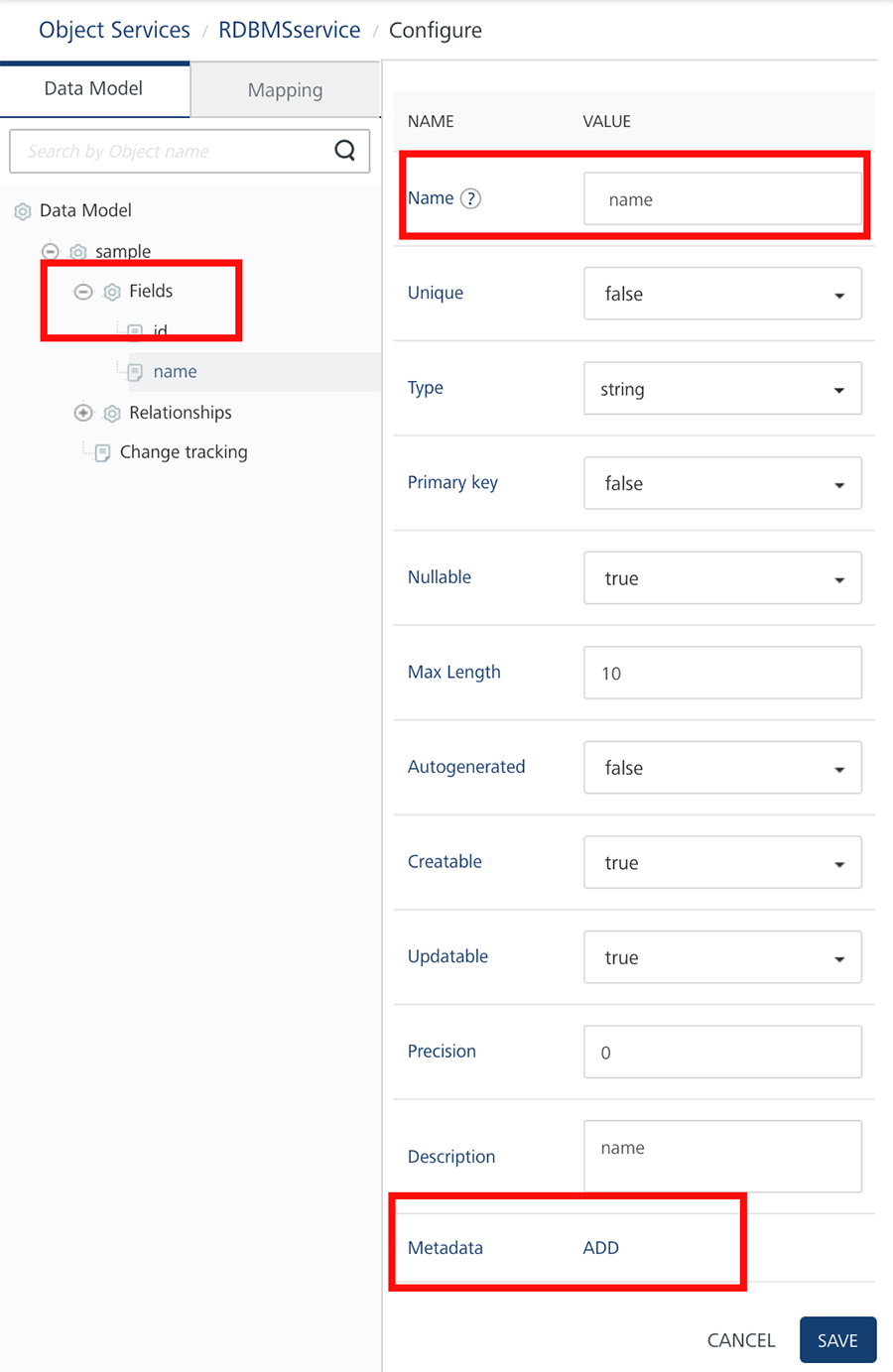 - Click Add to create a field. Specify the field name and data type and primary key, as required. Add fields in the object.