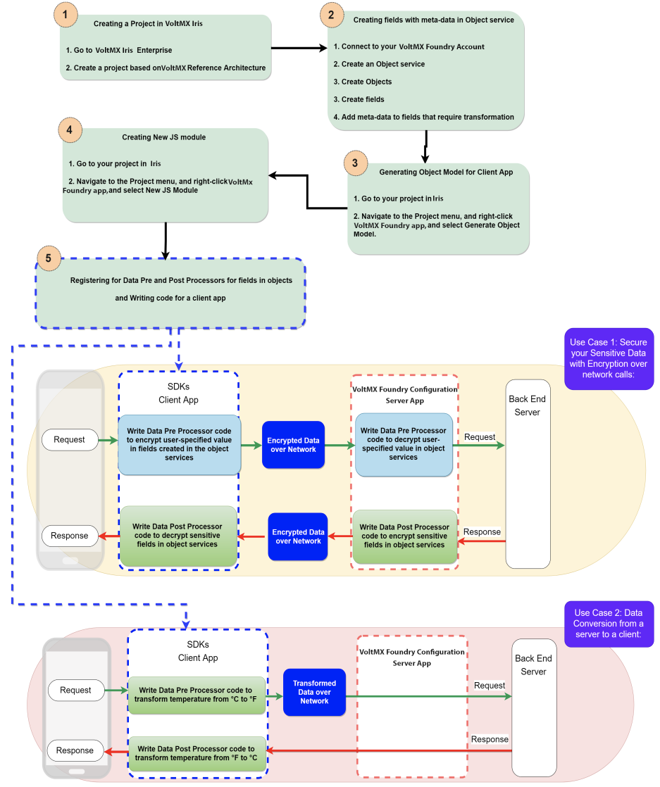 You can use data pre and post processors functionality on client apps as standalone or in conjunction with pre and post processors on Object services on server apps to achieve a variety of business requirements. For example, you can write your custom logic for fields in models to transform data in client before sending to back end and vice versa such as data encryption, decryption, currency or temperature conversion, prepend or append characters such as salutations (Mr. or Dr.) or currency symbol ($ or €) and so on.